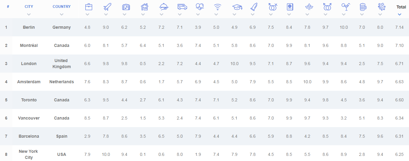 وشملت المراكز الخمسة الأولى أيضاً أمستردام ، التي احتلّت المرتبة الأولى في جدول عام 2017 ، وتورونتو ، اللتين مثلتا مونتريال على نحو جيد فيما يتعلق بالتسامح تجاه المهاجرين.