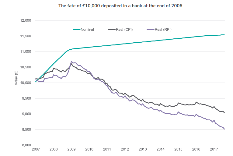بما أن التضخم كان أعلى من الاهتمام الذي تلقيته ، فإن قوتك الشرائية آخذة في الانخفاض. تظهر الخطوط السوداء والبنفسجية في المخطط التأثير مع مرور الوقت لهذه المشكلة. يُظهر السطر الأسود قيمة ما يستحق قيمته 10 الاف جنيه إسترليني بعد إضافة الفائدة التي تتلقاها وبعد ذلك أخذ مؤشر اسعار المستهلك في الاعتبار. يظهر الخط البنفسجي نفس الشيء ولكن مع مراعاة RPI.